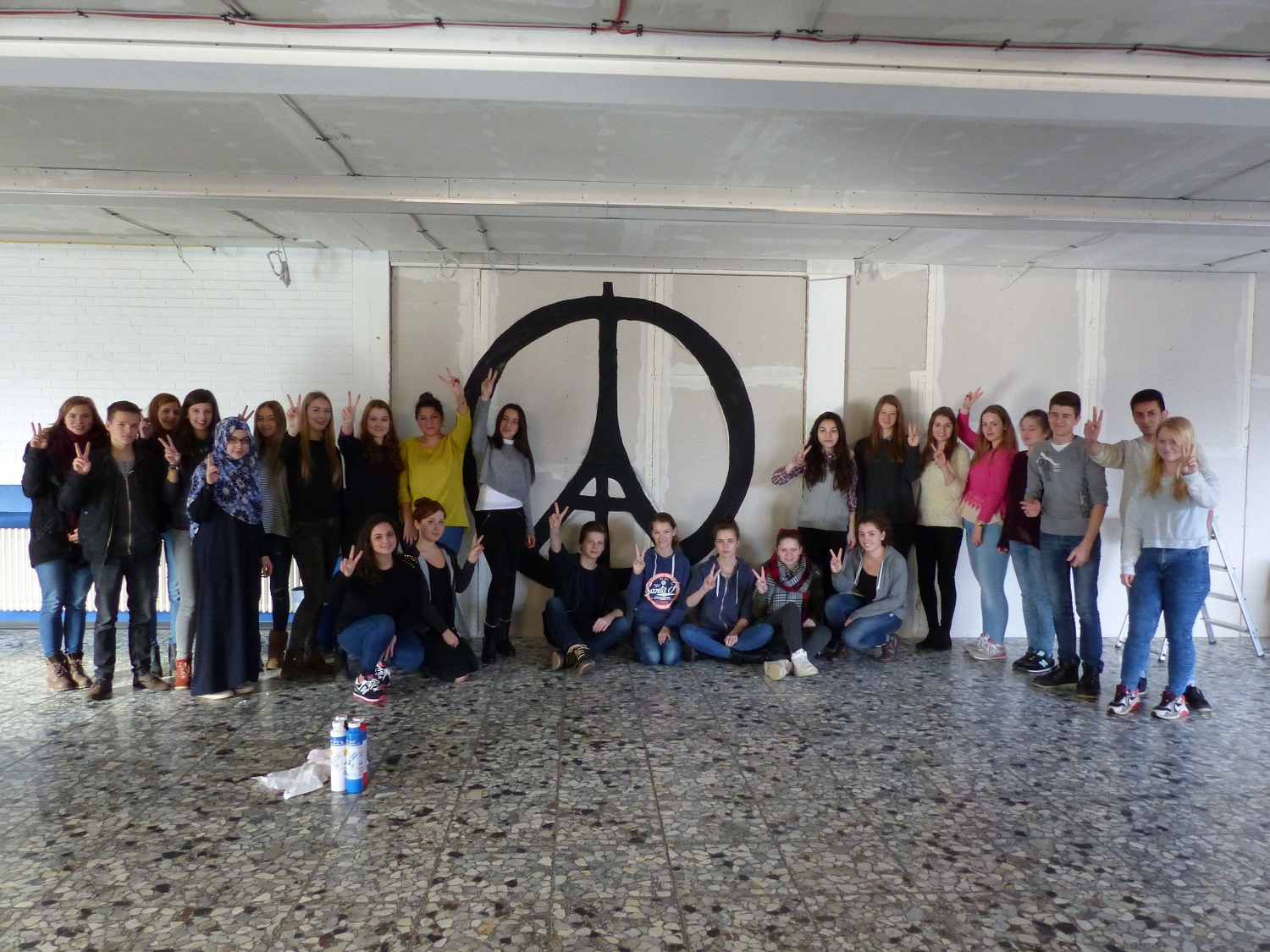 Die Kunstkurse von Frau Rahe der 10. und 11. Jahrgangsstufe sowie einige Helfer der unteren Jahrgänge haben eine Baustellenwand mit dem „Peace for Paris“ Symbol gestaltet. Hier einige Bilder, die den Entstehungsprozess sowie die Beteiligten zeigen.
