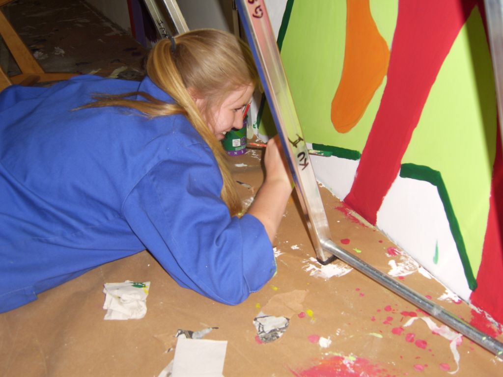 Die Bauwand, welche die Baustelle im Pausenhallenbereich vom regulären Schulbetrieb trennt, wird durch die Fachgruppe Kunst farblich gestaltet. Unter der Leitung von Frau Rahe, Frau Diekmann und Frau Besuden wurde jeweils ein Teilbereich von Schülerinnen und Schülern gestaltet. Die Klassen 10 A , 10 C, 10 D, und 10 E gestalteten zum Beispiel im Rahmen des Kunstunterrichts bei Frau Besuden ein größeres Wandbild auf der Bauwand. Es wurden thematische Schwerpunkte miteinander verknüpft, wie z.B. Graffiti der GSG-Buchstaben und Stadtsituationen. Diese wurden durch unterschiedliche Figurenkombinationen miteinander verbunden. Auch das Solidaritätsprojekt der Schule für Rivera Collata in Peru wurde in einem anderen Teil thematisiert.
