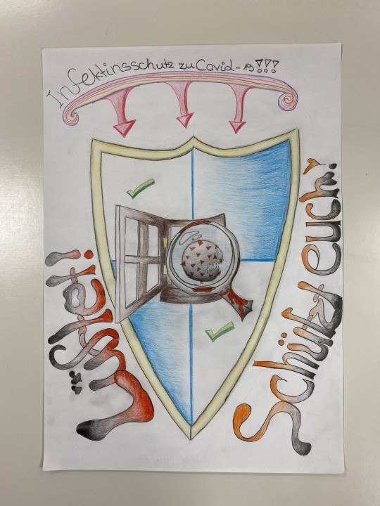 Die anfängliche analytische Werbebildbetrachtung wechselte schließlich in eine praktische Gestaltung, welche ein aktuelles Thema aufzeigen sollte. Dieses fanden die SchülerInnen im breit angelegten Leitgedanken des „Infektionsschutzes“. Mit viel Freude, hohem Arbeitseinsatz und kreativen Ideen lieferten die Klassen folgende Gestaltungskonzepte.