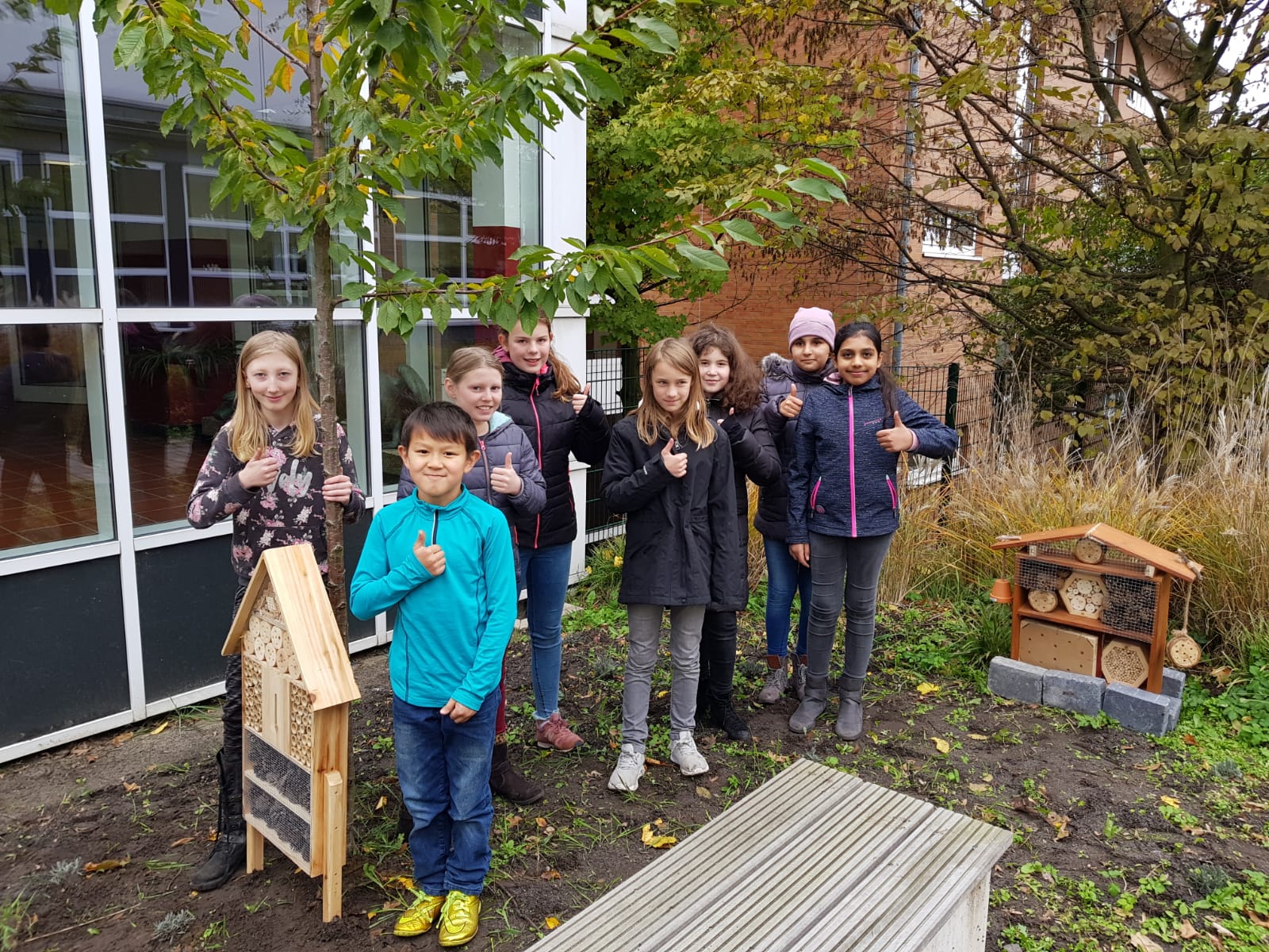 Zur Förderung der Artenvielfalt hat die Umwelt-AG zusammen mit der Nawi-AG zwei Insektenhotels im Innenhof aufgestellt. Ein Insektenhotel hat die Nawi-Ag bereits im letzten Schuljahr zusammen mit Fr. Meyer in der Nawi-Ag gebaut. Das andere Insektenhotel wurde von der Umwelt-AG mithilfe des Fördervereins angeschafft und zusammengebaut.