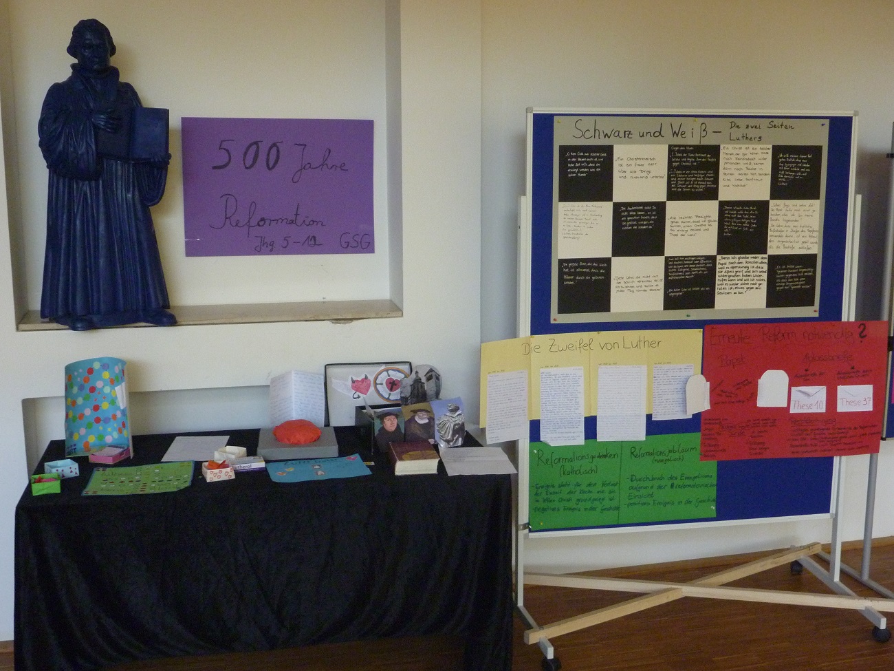Passend zum Reformationstag 2017 hinterlässt das 500-jährige Reformationsjubiläum auch am Graf-Stauffenberg-Gymnasium seine Spuren. In den vergangenen Monaten haben sich im Religionsunterricht verschiedene Lerngruppen mit diesem Thema beschäftigt und dazu kreative und informative Präsentationen erstellt. Diese wurden nun zu einer Ausstellung zusammengetragen, die in den Wochen rund um den Reformationstag in der Aula des GSG zu besichtigen ist.