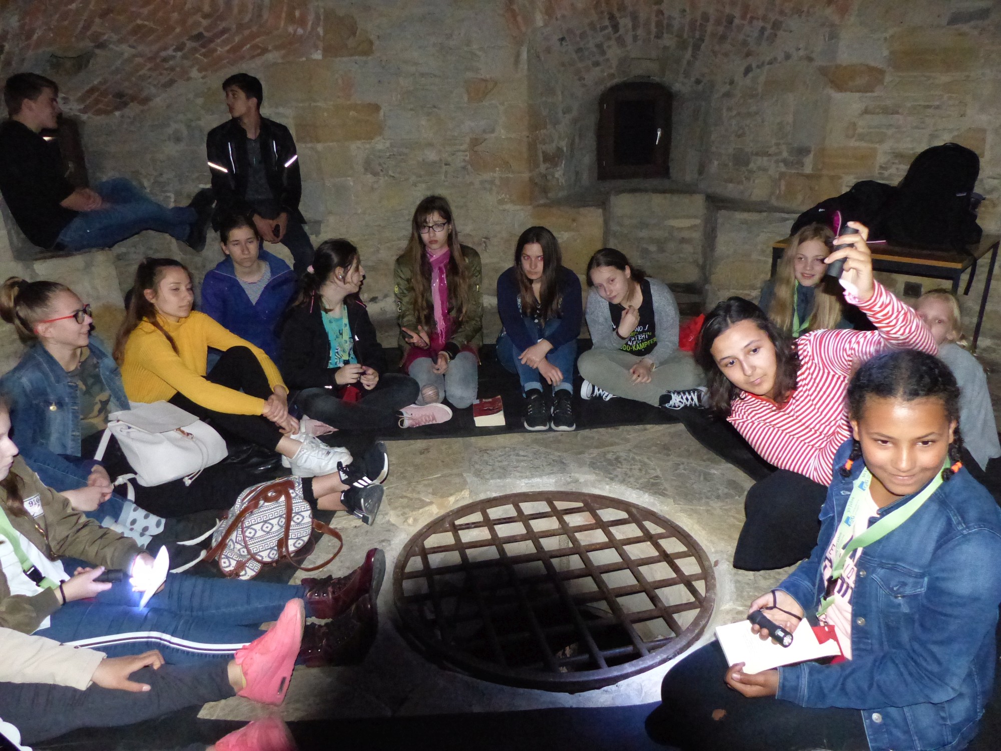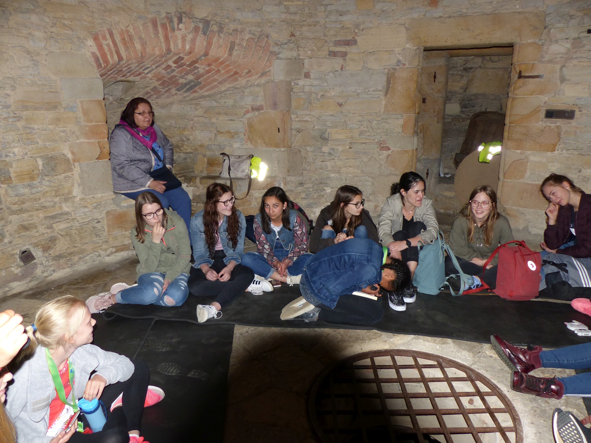 Die Schülerinnen haben sich intensiv, u.a. anhand von Sprachübungen, auf eine performative Präsentation ihrer Texte im Wehrturm „Bürgergehorsam“ vorbereitet. Die Wirkung von Kälte, Dunkelheit sowie von dicken Mauern des Turmes ist dabei besonders berücksichtigt.