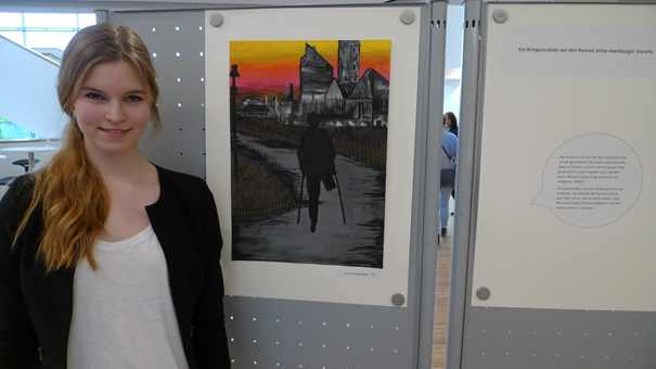 Schülerinnen und Schüler der Klassen 10b und 10d setzten Fotografien zum Kriegsende malerisch um. Im Geschichtsunterricht schrieben 5. Klässler mögliche Gedanken der auf den Fotografien Abgebildeten in Sprechblasen auf.