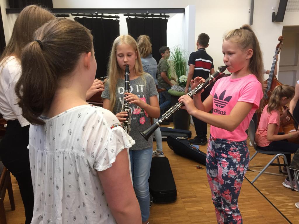 Vorausgegangen war eine Vorstellung der Instrumente durch Schülerinnen und Schüler der höheren Jahrgänge, die, nachdem sie ihr Können präsentiert hatten, bereitwillig die Begleitung der ersten Spielversuche übernahmen.