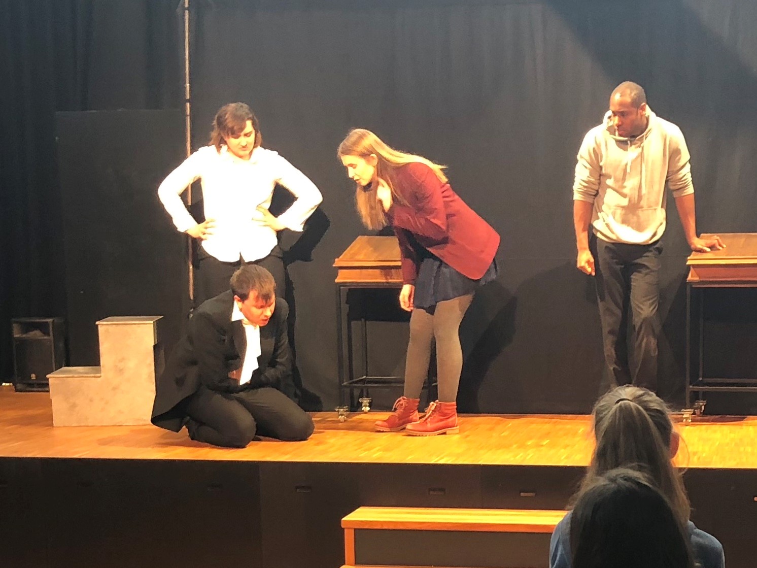 Erfreulich waren auch die angeregten Fragen der Schülerinnen und Schüler an das Schauspielensemble. Die Fragen drehten sich um die Wahrnehmung der Akteure von Deutschland, ihrer Motivation für Auftritte an deutschen Schulen und zur Arbeit im Theater allgemein. So wollte eine Schülerin gern wissen, ob die Schauspieler immer noch Lampenfieber hätten. Eine weitere Schülerin interessierte, ob es schwer sei, als Frau eine Männerrolle zu spielen und als die Schauspieler dann noch verrieten, dass sie ihre drei Stücke im Repertoire innerhalb von vier Wochen einstudieren müssten, war das Erstaunen groß. Sogar noch nach der Vorführung standen die Mitglieder des Ensembles den interessierten Schülerinnen und Schülern, aber auch den Kolleginnen und Kollegen zur Verfügung. Dem White Horse Theatre und allen Beteiligten ein herzliches Dankeschön für die gelungene Show.