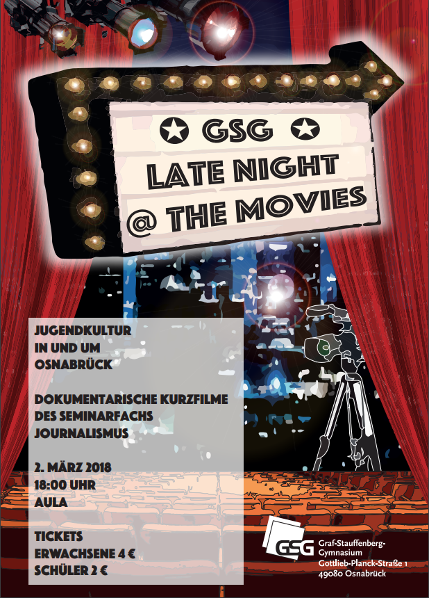 Diese Filme möchten wir nun im Rahmen der „GSG Late Night @ the movies“ dem breiten Publikum zugänglich machen. Wir würden uns freuen, Sie am 2. März 2018 um 18:00 Uhr bei unserer Veranstaltung als Gast begrüßen zu dürfen. Wir freuen uns auf einen unterhaltsamen Filmabend, ergänzt durch Kleinkunst, Musik und Interviews. Für das leibliche Wohl ist gesorgt. Tickets (Erwachsene 4€, Schüler*innen 2€) sind während der Pausen in der Pausenhalle und an der Abendkasse erhältlich.