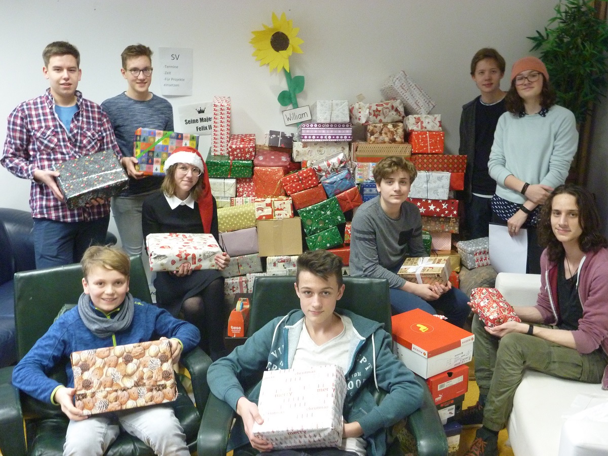 Und schließlich wurde die SV noch selbst aktiv beim Päckchenpacken. Vom Erlös einer Plastikflaschen-Sammelaktion auf dem Schulgelände konnten noch 30 weitere Päckchen zusammengestellt werden.