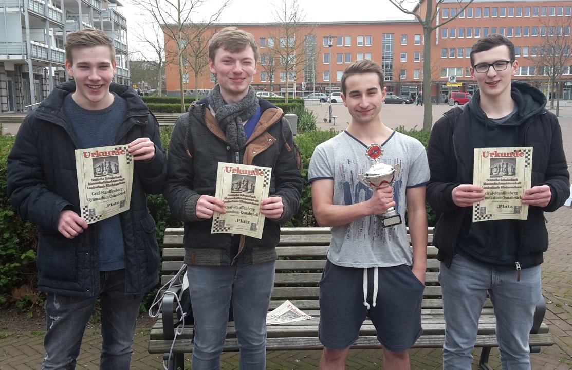 Hannover/Osnabrück. Am 03.04.2019 fand das Landesfinale der niedersächsischen Schulschach-Mannschaftsmeisterschaft 2019 in Hannover statt. Das Team des Graf-Stauffenberg-Gymnasiums Osnabrück konnte seinen Titel in Wettkampfklasse 1 ungefährdet verteidigen.