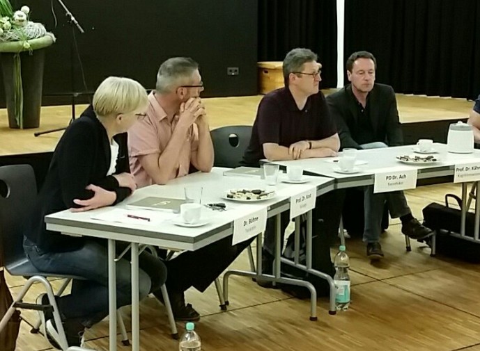 Auch die vierte Auflage des Philosophischen Gesprächskreises am GSG am 17.10.2017 beschäftigte sich mit einem Thema von höchster Aktualität: Der Kognitionswissenschaftler Prof. Dr. Kai-Uwe Kühnberger, der Evolutionsbiologe Prof. Dr. Christian Kost, der Bioethiker PD Dr. Johann S. Ach und die Tierärztin Dr. Inge Böhne waren unserer Einladung gefolgt und diskutierten mit einem interessierten und engagierten Publikum aus Schülerinnen und Schülern der Jahrgänge 11 (EF), Q1 und Q2 Auswirkungen und Probleme aktueller Bestrebungen der Optimierung und Verbesserung der natürlichen Evolution bei Tier und Mensch durch Gentechnologie und Enhancement.