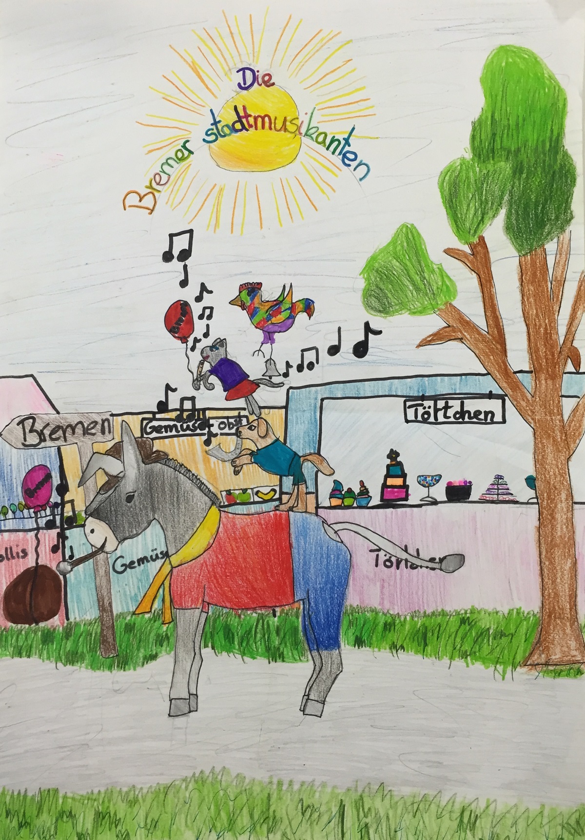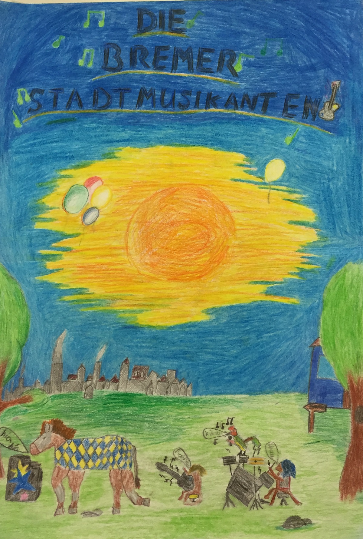 Die visuelle Gestaltung sollte in Form einer Buntstiftzeichnung ausfallen, in der die einzelnen Tiere als individuelle Gruppe Anordnung fanden. Neben der Komposition sollte jedes Tier sowohl tierische, als auch menschliche Merkmale erhalten. Außerdem sollten die kleinen Künstler auf den jeweiligen Ausdruck des Tieres, mit Mimik und Gestik, achten. Unterstützung sollte dieser durch den Einsatz von „Ausdrucksfarben“, wie sie bereits bei den Tierbildnissen von Franz Marc festgestellt wurden, finden. Im Zentrum des Musikunterrichts von Herrn Wiggers stand die Gestaltung eines Liedes über die Bremer Stadtmusikanten. Für die im Lied enthaltenen wörtlichen Beiträge von Tieren und Räubern haben die Schüler/innen hierbei mit den klanglichen Verfremdungsmöglichkeiten ihrer Stimme experimentiert. Zudem wurde mit Instrumenten und Stimme die von den Tieren beobachtete „Räuberfeier“ klanglich umgesetzt. Zum Abschluss der Einstudierung erfolgte eine Aufnahme des Liedes inklusive der Klanggestaltung.