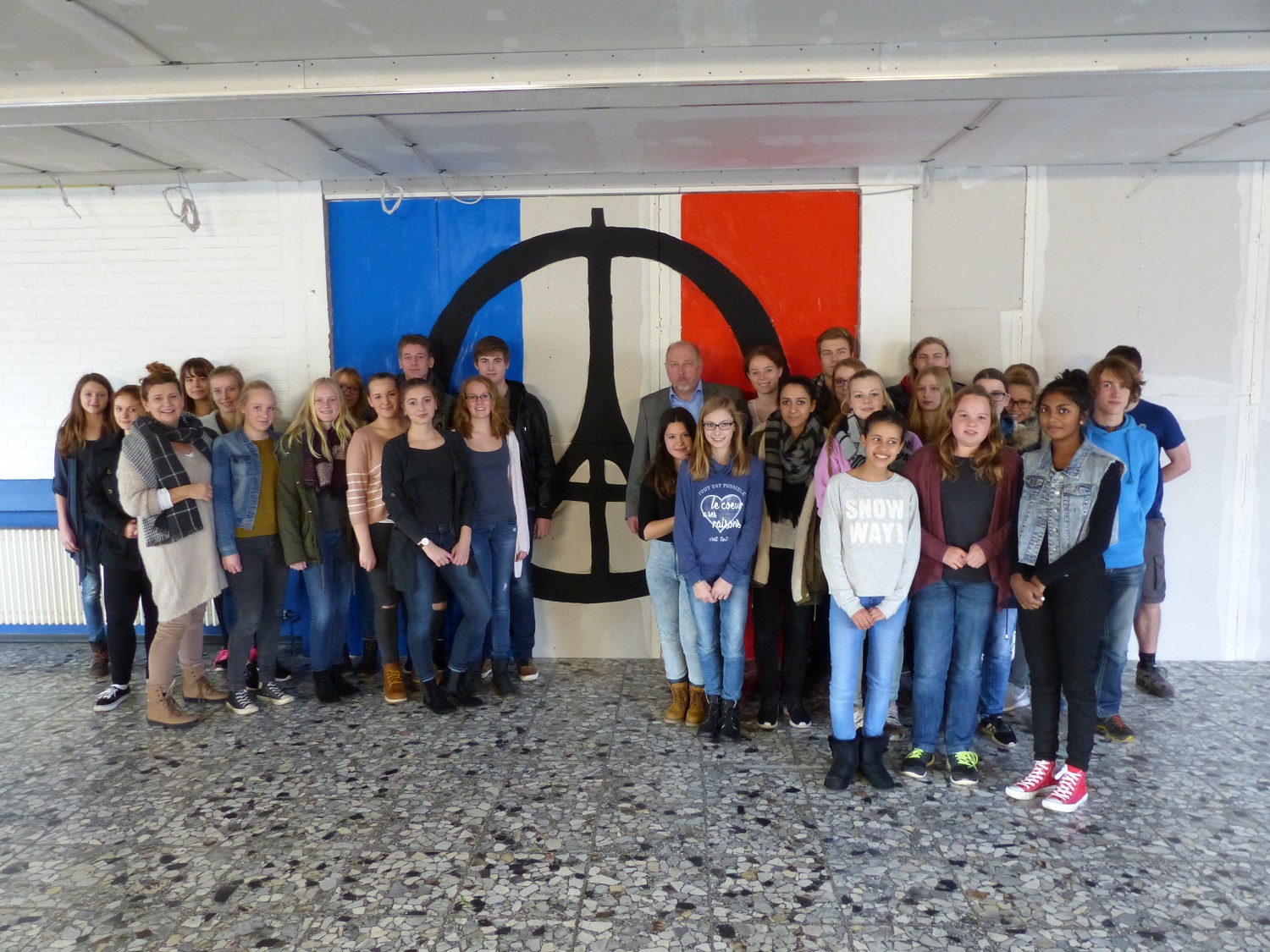 Die Kunstkurse von Frau Rahe der 10. und 11. Jahrgangsstufe sowie einige Helfer der unteren Jahrgänge haben eine Baustellenwand mit dem „Peace for Paris“ Symbol gestaltet. Hier einige Bilder, die den Entstehungsprozess sowie die Beteiligten zeigen.