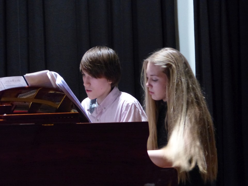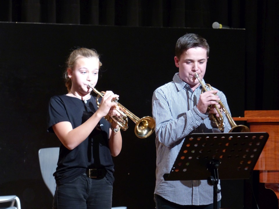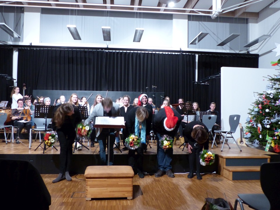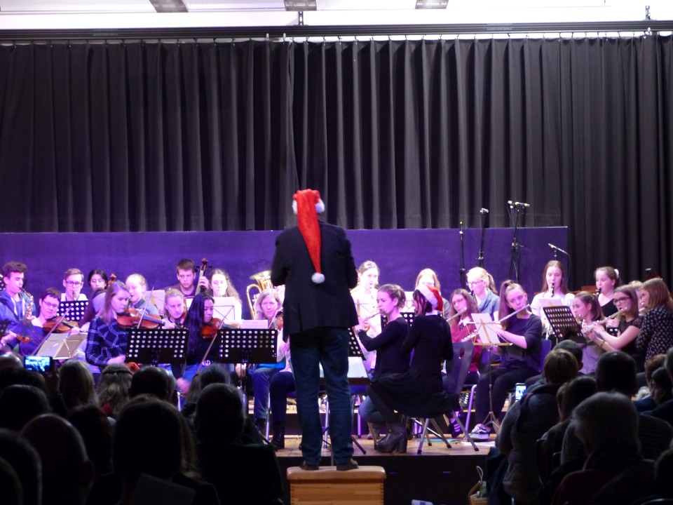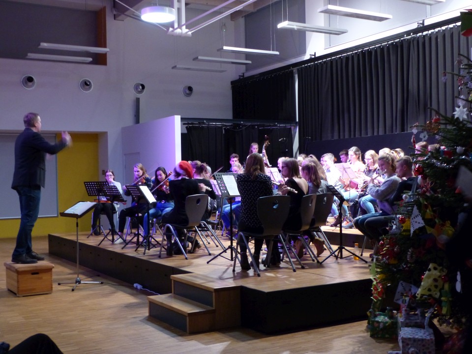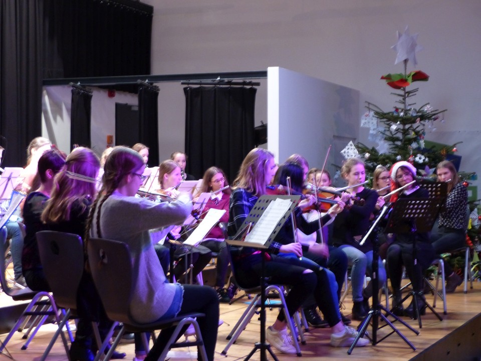 Fast 100 aktive Schülerinnen und Schüler der zahlreichen Musik-AGs freuten sich, am 19.12.2018 ihre erarbeiteten Weihnachtsprogramme einer bis auf den letzten Platz gefüllten Aula präsentieren zu können. Neben den Beiträgen der AGs VorOrchesters, Stauffis, Pop-Chor und Orchester waren während des abwechslungsreichen Konzerts auch solistische Beiträge von Finn Zöller (Gitarre), Jonas Mönkedieck und Maja Schiotka (Trompete), Katharina Artamonova und Nikita Chmoul (Klavier) sowie vom Trio Chocolat zu hören.
