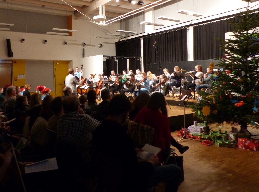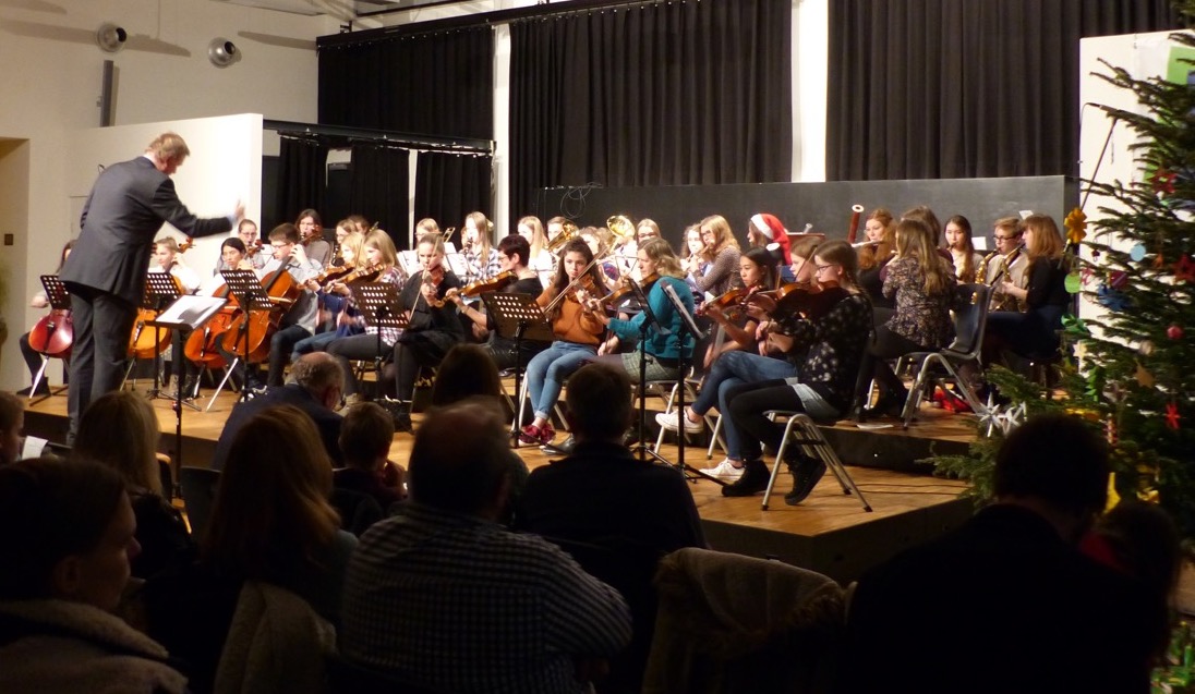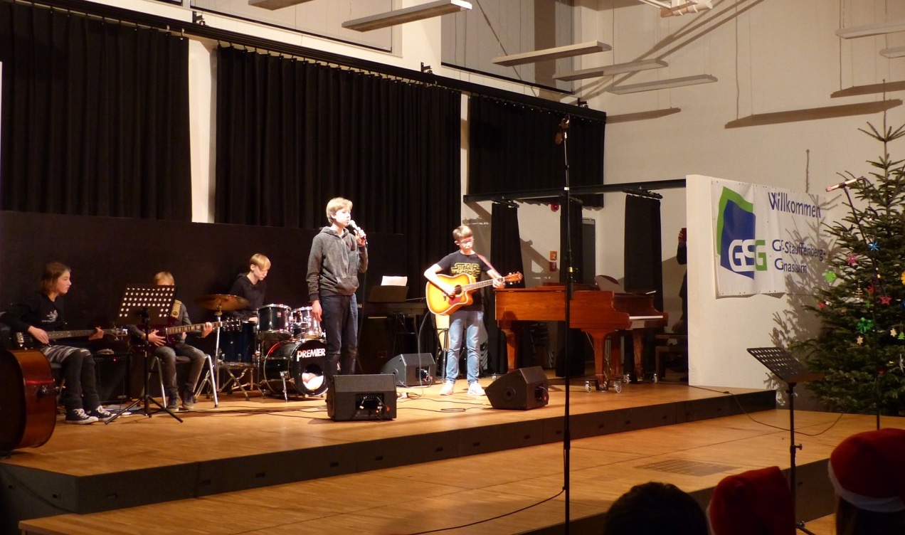 Die fast 100 aktiven Schülerinnen und Schüler der zahlreichen Musik-AGs konnten sich beim Weihnachtskonzert 2017 über eine bis auf den letzten Platz gefüllte Aula freuen. In den kurzweiligen 90 Minuten des Konzerts präsentierten die AGs VorOrchester, Stauffis, Junior-Band, KlezmerExperience, Pop-Chor, Schulband und Orchester ihre erarbeiteten Weihnachtsprogramme. Charmant durch den Abend führten erstmals zwei Schülerinnen und ein Schüler der Q2, wobei die Schüler der Light&Sound-AG dafür sorgten, dass alle Beteiligten immer gut zu sehen und zu hören waren. Das gemeinsames Singen aller Beteiligten mit den Besucherinnen und Besuchern zur Musik des Orchesters sorgte schließlich für einen wunderbaren Abschluss eines gelungenen Konzertabends.