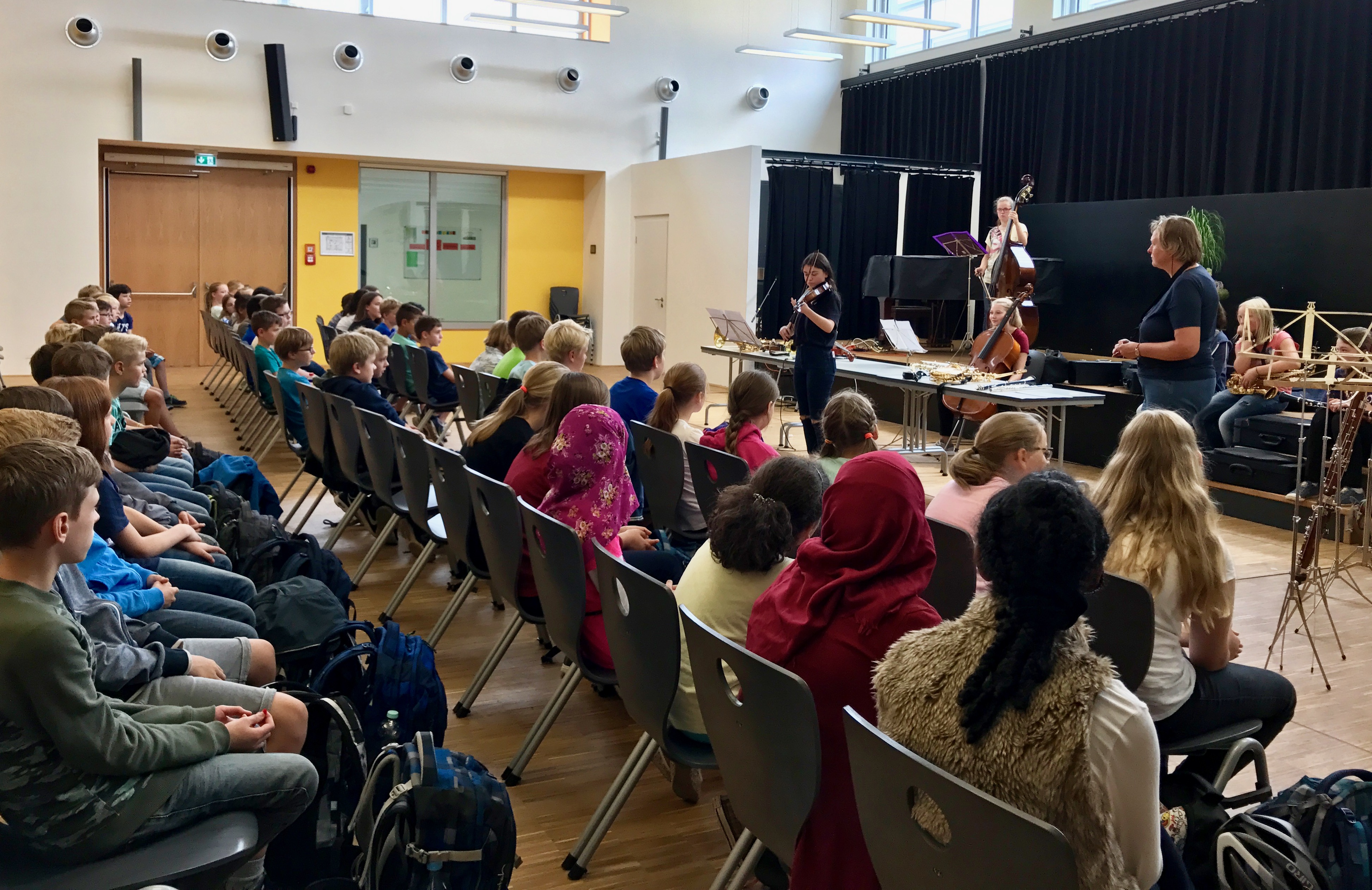 Schülerinnen der höheren Jahrgänge, die über „Musikus“ zu versierten Instrumentalistinnen geworden sind, stellten ihre Instrumente in der Aula den Mitschülerinnen und Mitschülern vor und auch Herr Zwartscholten und Frau Hüne griffen zu Posaune und Fagott, um die vielen unterschiedlichen Instrumente des GSGs vorzustellen, die wie jedes neue Schuljahr „neue Spieler suchen“.