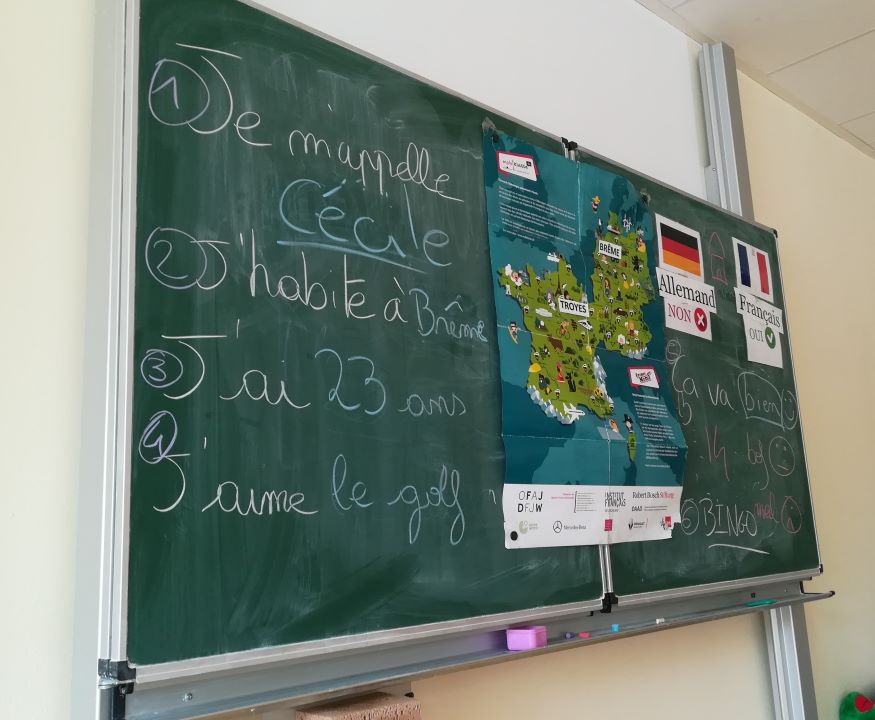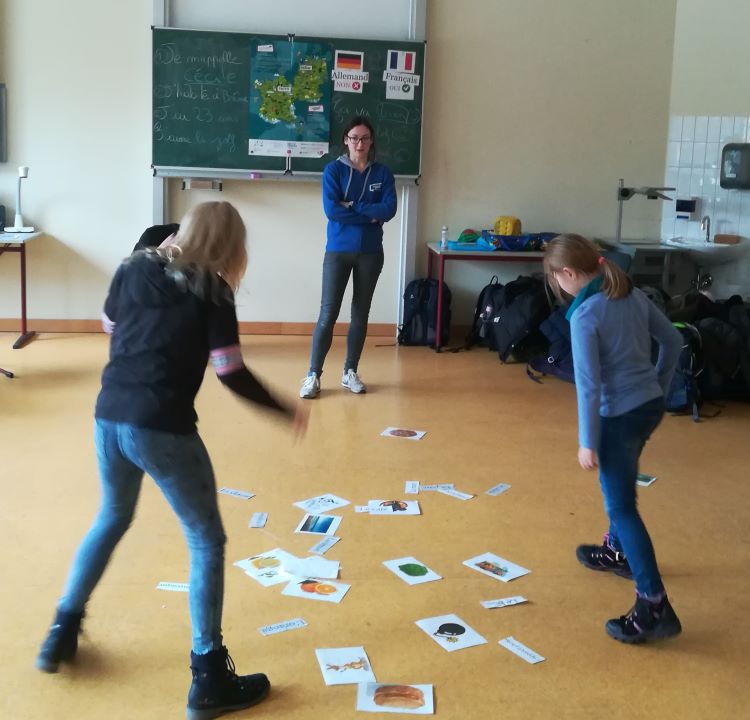 Die 23-jährige Cécile Larralde ist in diesem Schuljahr die Lektorin für Bremen und Niedersachsen und hat am 07.11.19 das GSG besucht. Für die Animationen mit den Klassen hatte sie zahlreiche kreative Ideen mitgebracht. Nachdem Cécile sich vorgestellt hat – selbstverständlich auf Französisch – sollten die Schülerinnen und Schüler sich bei einem spannenden Würfelspiel zu Musik selbst vorstellen. Durch das motivierende und spielerische Vorgehen schafften es alle, trotz fehlender Vorkenntnisse, ihren Namen, ihr Alter, ihren Wohnort oder sogar ihr Hobby auf Französisch anzugeben. Anschließend mussten in einem kleinen Wettkampf so schnell wie möglich Fotos den passenden französischen Begriffen zugeordnet werden. Sofort stellten alle dabei fest: „Die Wörter klingen auf Französisch ja fast genauso wie auf Deutsch!“ Sowohl der jungen Französin wie auch den Schülerinnen und Schülern machte es riesig Spaß und am Ende gab es nur positive Rückmeldungen: „Ich habe fast alles sofort verstanden!“, „Es hat total Spaß gemacht!“, „Französisch ist echt cool!“. Die Neugier auf die neue Fremdsprache wurde sichtlich gesteigert.