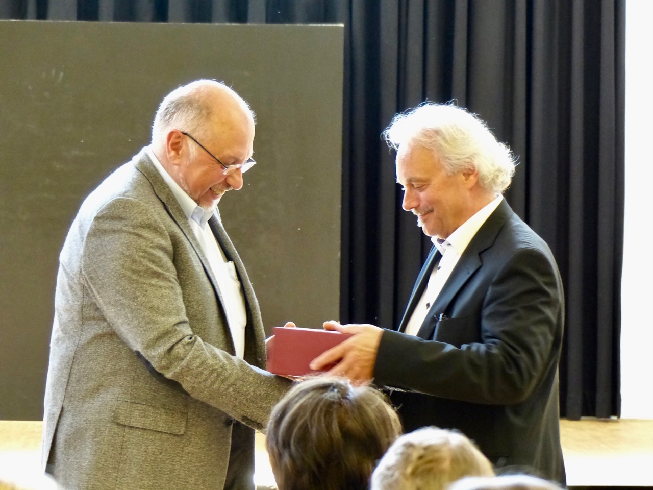 „Vielen Dank, Gerrit Loets, dass es dir gut ergeh‘. / Wir hoffen auf ein Wiedersehn.“ Der langjährige Fachobmann für Musik musste natürlich mit Georg Kreisler und eigener Komposition von seiner Fachgruppe humorvoll und herzlich verabschiedet werden. Der engagierte Deutschlehrer, Theaterbegeisterte, „junggebliebene Stürmer und Dränger“, der besonnene und mit geistreichem Witz die Schule bereichernde Kollege wurde auch mit einer Lobrede des Fachobmanns Deutsch, Herrn Dr. Bick, bedacht. In einem satirischen Parforceritt durch Gegenstände des Deutschunterrichts wie bürokratische Gegebenheiten pries dieser Gerrit u.a. – frei nach Georg Büchners „Danton“ –als nicht zu ersetzende Größe in unserem Schulleben: „Männer meines Schlages sind in der Schule unschätzbar.“