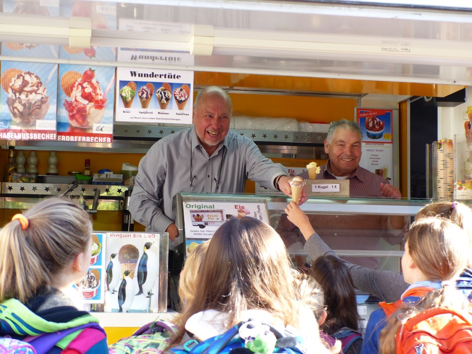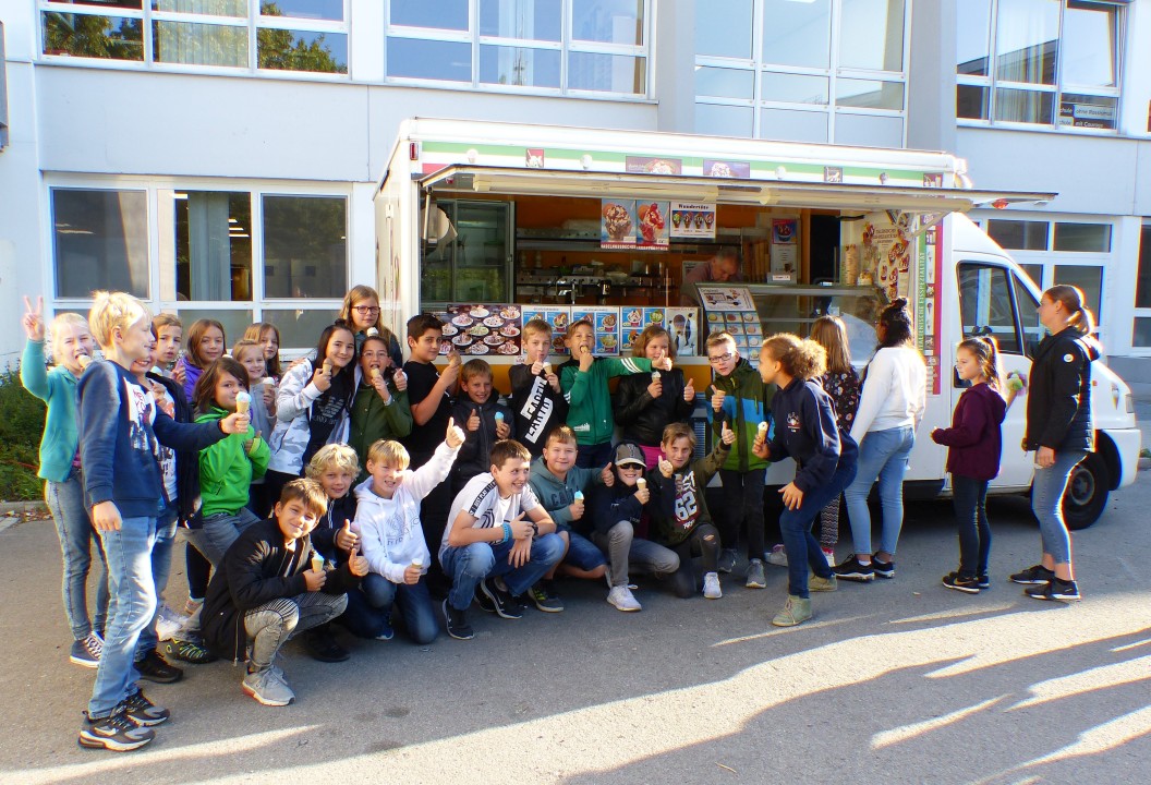 Aber Herrn Krotzek war es ein Anliegen nochmal außerhalb der offiziellen Feierlichkeiten auf ganz besondere Weise „Tschüß!“ zu sagen: Zur Freude aller fuhr kurz nach Beginn der ersten Stunde ein Eiswagen auf dem Schulhof vor. Herr Krotzek folgte bald darauf mit seinem Fahrrad. Dann wurden alle Schülerinnen und Schüler sowie auch alle Beschäftigten von unserem ehemaligen Schulleiter auf ein Eis eingeladen. Bei der Ausgabe der Eistüten half Herr Krotzek tatkräftig mit.