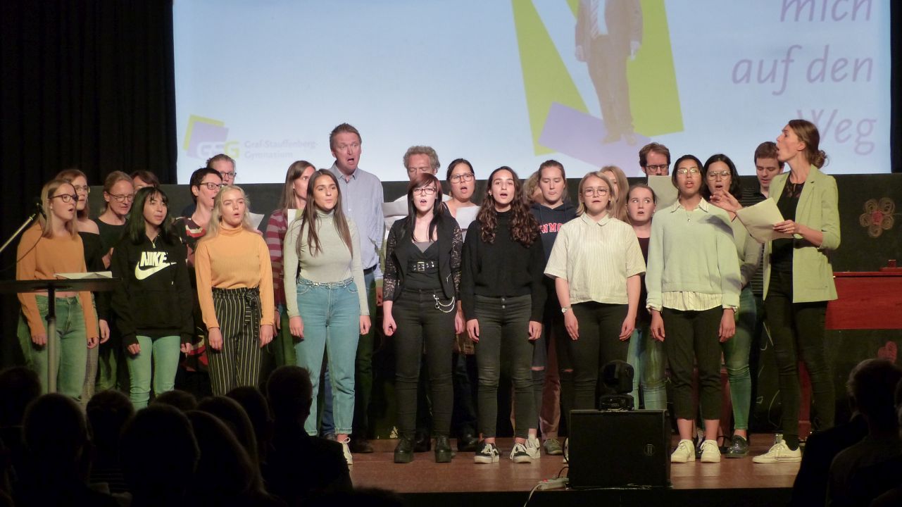 Der Nachfolger Krotzeks im Amt des Schulleiters, StD Thomas Grove, gab mit einleitenden Worten den roten Faden für die Feststunde an. An einem solchen Tag der feierlichen Verabschiedung könne man das Stauffenberg-Gymnasium gut kennen lernen. Die anschließende Darbietung der Schülerinnen und Schüler sei Teil des sehr erfolgreich aufgeführten Theaterstücks unter dem Titel „Frei wie der Wind – Götter wir sind“ des Stürmer und Drängers Jakob Michael Reinhold Lenz – und am heutigen Tage auf den scheidenden Schulleiter abzuwandeln, für den gelte: „GSG – du bist.“ Das Freiheitsmotiv wurde dann auch von den Schülerinnen und Schülern in einer Pink Floyds „We don’t need no education“ aufnehmenden Performance eindrucksvoll in Szene gesetzt.