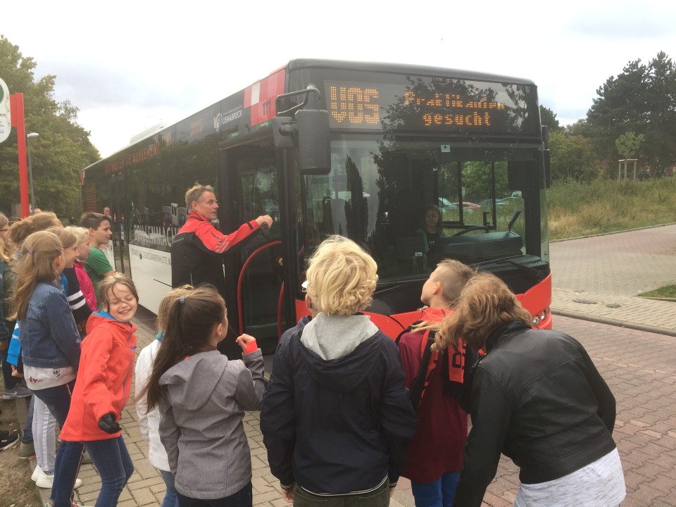 Zu Beginn des Schuljahres üben die Schülerinnen und Schüler der 5. Klassen mit einem Mitarbeiter der Stadtwerke das Verhalten vor und im Bus, damit alle ihren Schulweg sicher absolvieren können.