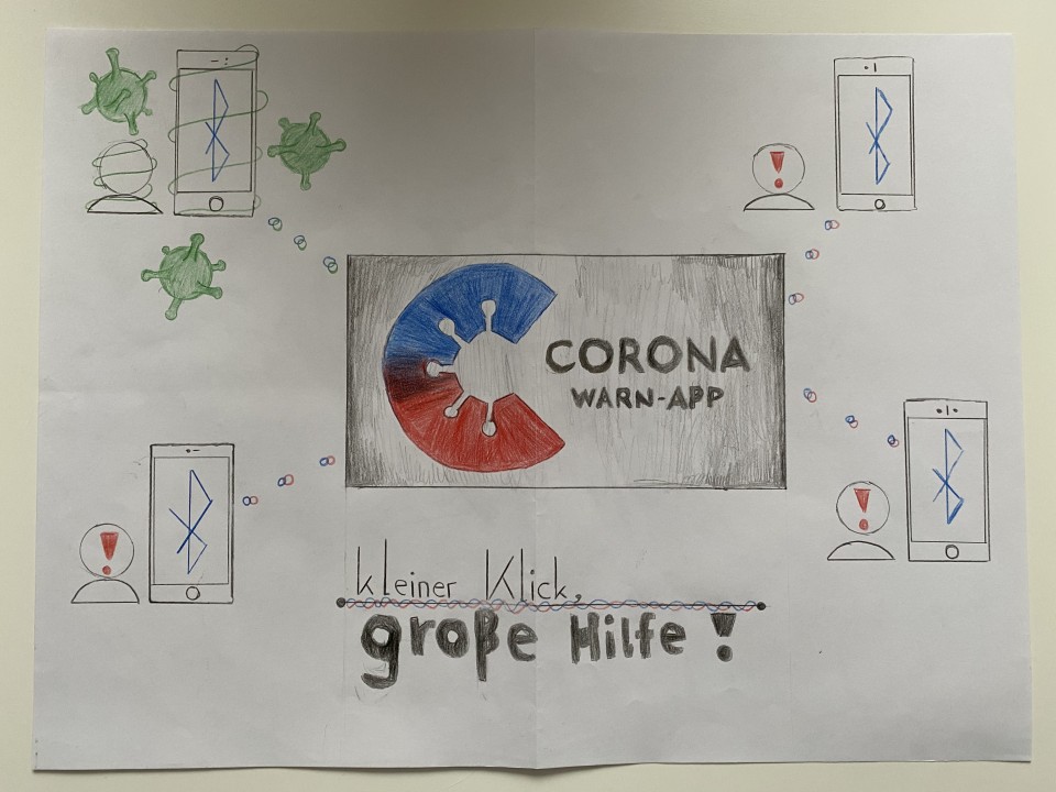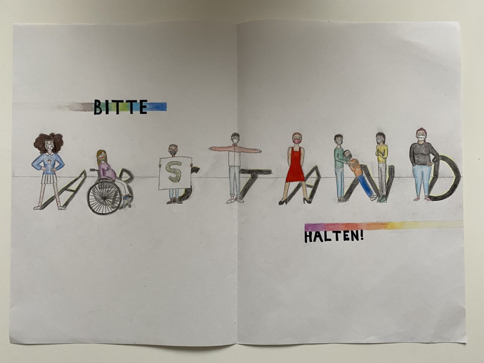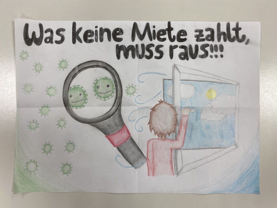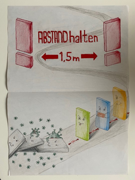 Die anfängliche analytische Werbebildbetrachtung wechselte schließlich in eine praktische Gestaltung, welche ein aktuelles Thema aufzeigen sollte. Dieses fanden die SchülerInnen im breit angelegten Leitgedanken des „Infektionsschutzes“. Mit viel Freude, hohem Arbeitseinsatz und kreativen Ideen lieferten die Klassen folgende Gestaltungskonzepte.