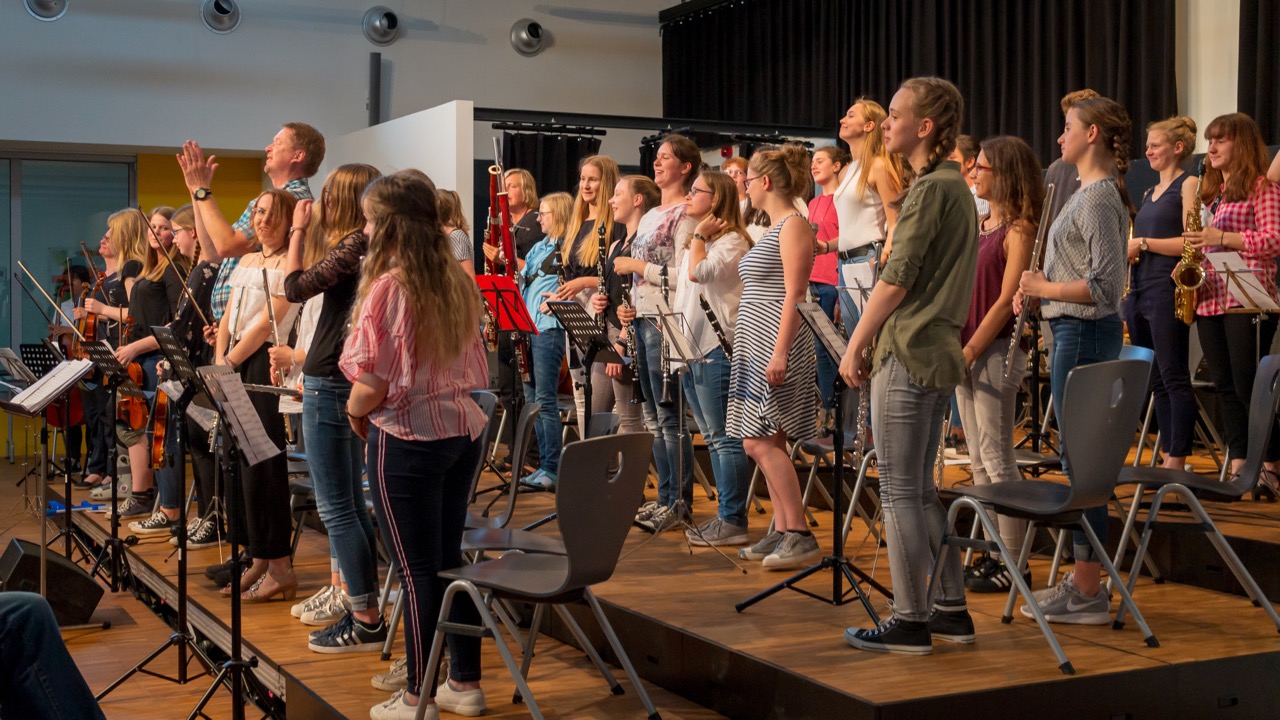 Mit einem rundum gelungenen Konzertabend schlossen knapp 100 in den vielen Arbeitsgemeinschaften des GSG musikalisch aktive Schülerinnen und Schüler am 18.6.2018 das Schuljahr 2017/18 in der Aula ab. Gemeinsam mit ihren Lehrerinnen und Lehrern präsentierten VorOrchester, Stauffis, Junior-Band, Pop-Chor, Schulband und Orchester Auszüge aus der Arbeit des letzten Halbjahres. Zwei solistische Beiträge und eine Spendenübergabe der Fruchtoase an Monsun e.V. rundeten den Abend ab.