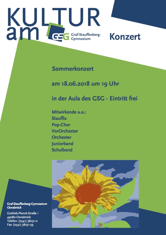 Am 18.6.2018 findet ab 19:00 Uhr das diesjährige Sommerkonzert in der Aula des GSG statt. Zum Abschluss des Schuljahres werden traditionell alle Musik-AGs des GSG spielen und singen. Zusätzlich werden aber auch einige solistische Beiträge von Schülerinnen und Schülern zu hören sein.