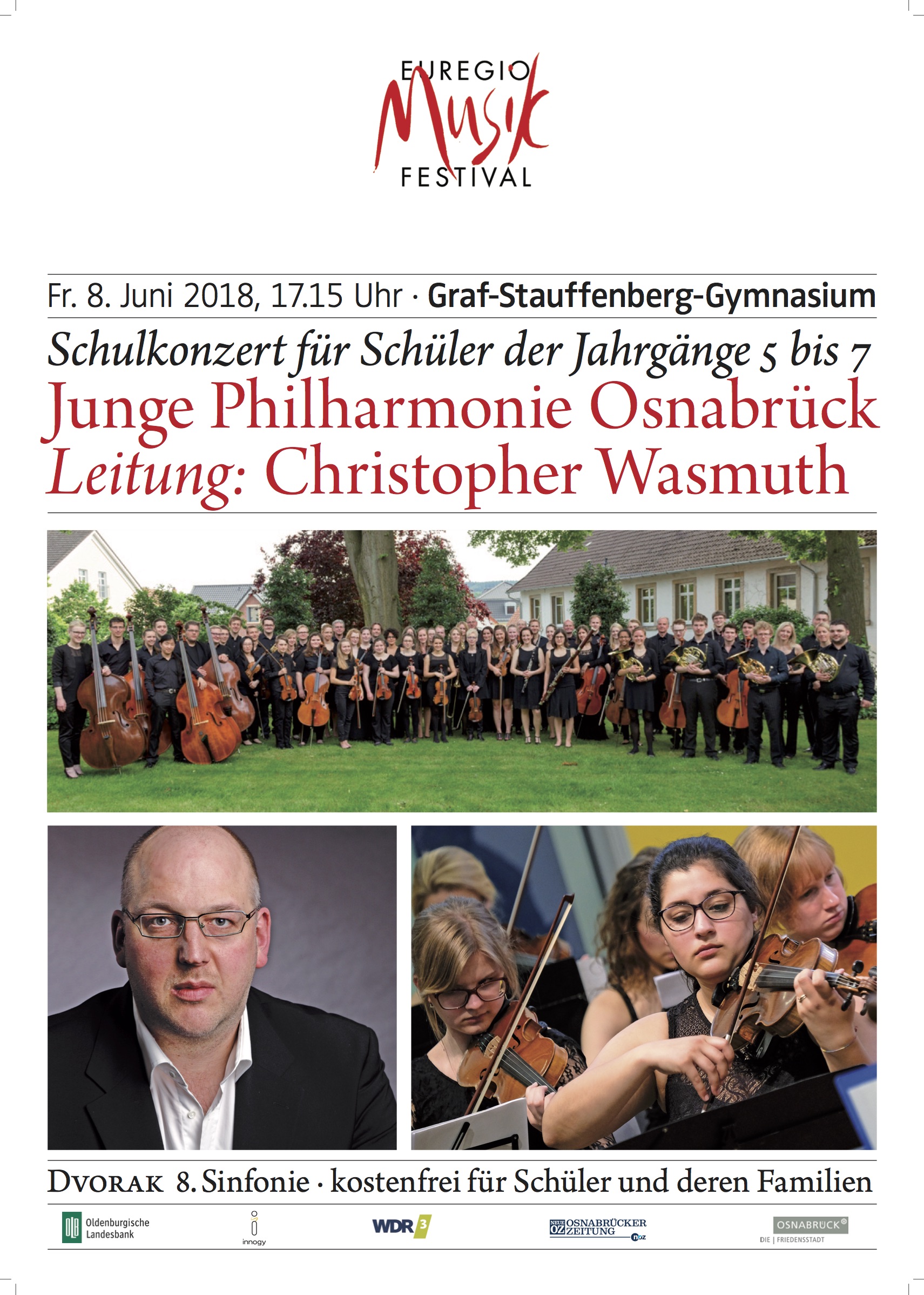 Am 8.6.2018 ab 17:15 Uhr wird die "Junge Philharmonie Osnabrück" unter der Leitung von Christopher Wasmuth in der Aula des GSG zu Gast sein. Die hervorragenden Musiker des jungen Sinfonieorchesters werden einen Teil ihres aktuellen Programms präsentieren. Im Zentrum des einstündigen Konzerts wird dabei die 8. Sinfonie von Antonin Dvorak stehen.