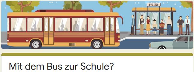 Unter dem Motto "Mit dem Bus zur Schule?" hat der Arbeitskreis "Optimierung der Schülerbeförderung" eine Umfrage ins Leben gerufen, die dabei helfen soll, die Situation im Busverkehr zu verbessern. Daher ist es wichtig, dass ihr als Nutzerinnen und Nutzer der Busse an der Umfrage teilnehmt.