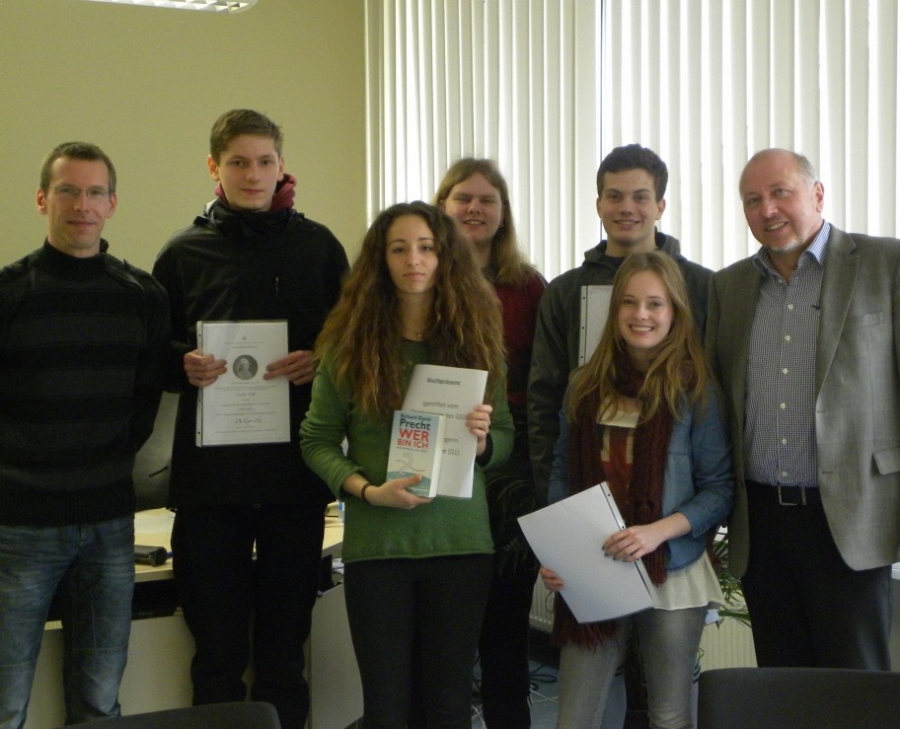 Paula Richter (Q1) durfte sich als Schulsiegerin über ein Buchpräsent freuen. Leonie Alefs und Victor Rolf (beide Q1) sowie Niklas Diekhoff und Tom Janßen (Q2) bekamen in einer Urkunde die Anerkennung des Vorsitzenden des Fachverbandes Philosophie in Niedersachsen, Till Warmbold, übermittelt. Gemeinsam mit ihren Philosophiekursen hatten sie sich im Dezember 2013 intensiv mit Themenstellungen wie etwa den Fragen nach der Beständigkeit des Daseins, nach der Sinnhaftigkeit demokratischer Mehrheitsentscheidungen oder dem moralischen Recht, über eigene Fähigkeiten alleine zu verfügen, beschäftigt und hierzu einen mehrseitigen philosophischen Essay verfasst.
