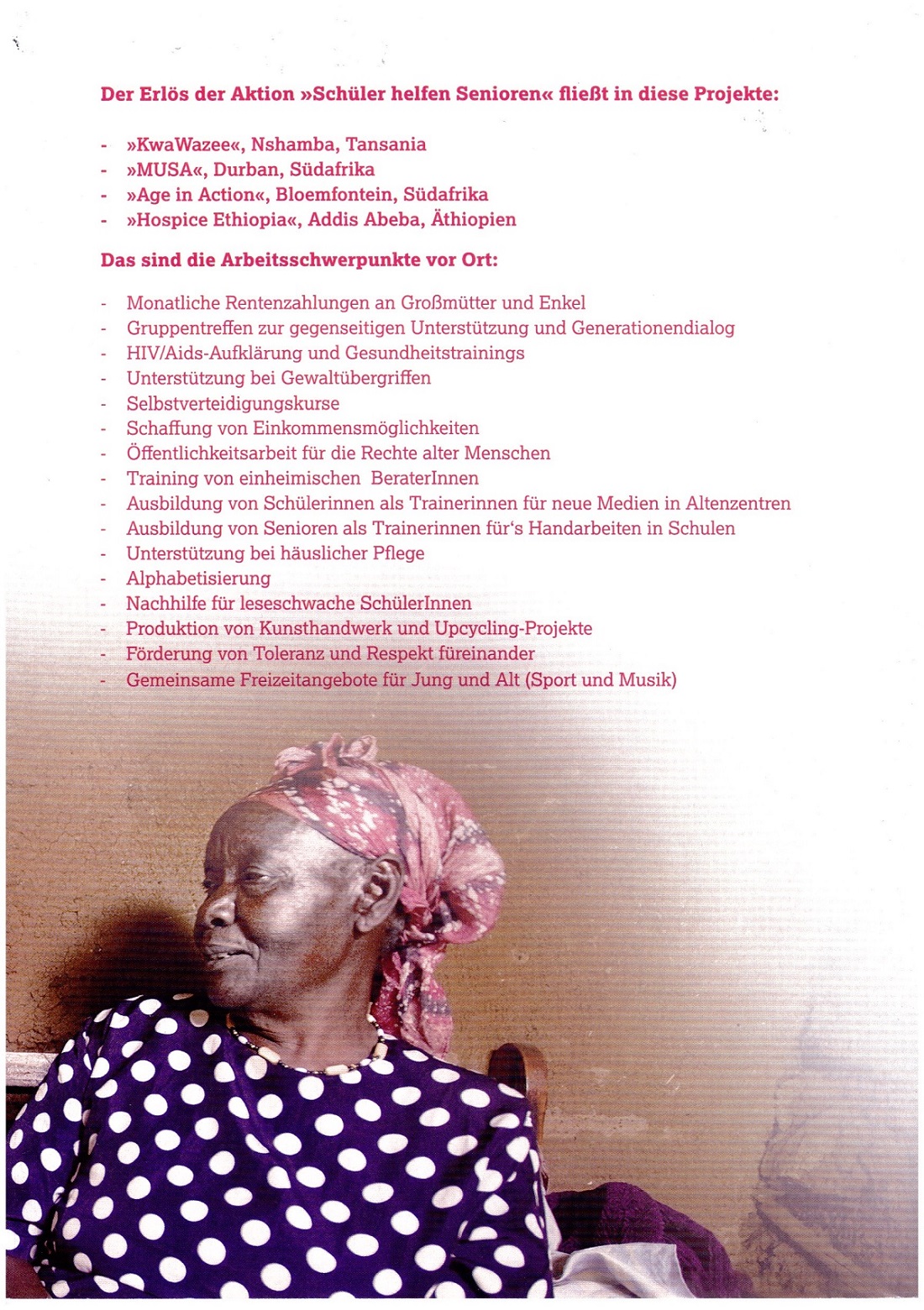 Ende des Jahres 2016 haben sich fünf Klassen an der Aktion für HelpAge beteiligt. Für diese Aktion helfen SchülerInnen älteren Menschen an einem Tag. Gleichzeitig informieren die SchülerInnen Freunde, ihre Familie und andere über die Arbeit von HelpAge und sammeln Geld dafür ein. Mit diesem Geld untersützt HelpAge wiederum ältere Menschen in Afrika.