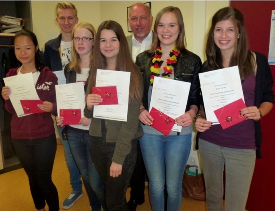 In der vorletzten Schulwoche überreichte der Schulleiter den Teilnehmern in einer kleinen Feierstunde ihre Urkunden und dankte ihnen mit einer kleinen Aufmerksamkeit für ihr besonderes Engagement, das weit über das übliche Maß des im Fremdsprachenunterricht geforderten hinaus geht.
