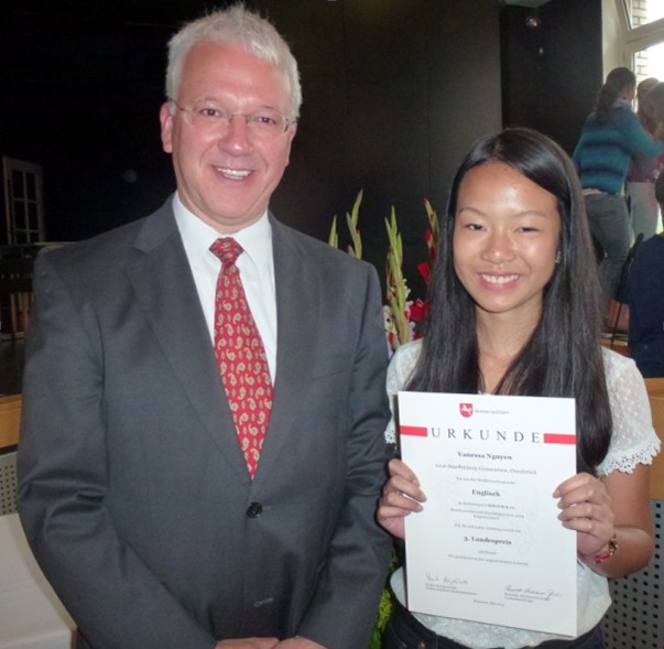 Zuvor konnte Vanessa Nguyen, Klasse 9c, sich über eine besondere Ehrung freuen. Aufgrund ihres hervorragenden Ergebnisses wurde sie Ende Mai im Rahmen einer Feierstunde am Gymnasium Marianum in Meppen mit einem 3. Landespreis ausgezeichnet. Dabei erhielt sie vom Beauftragten der Niedersächsischen Landesschulbehörde, Herrn StD Völpel, eine Ehrenurkunde sowie einen Geld- und Sachpreis überreicht.