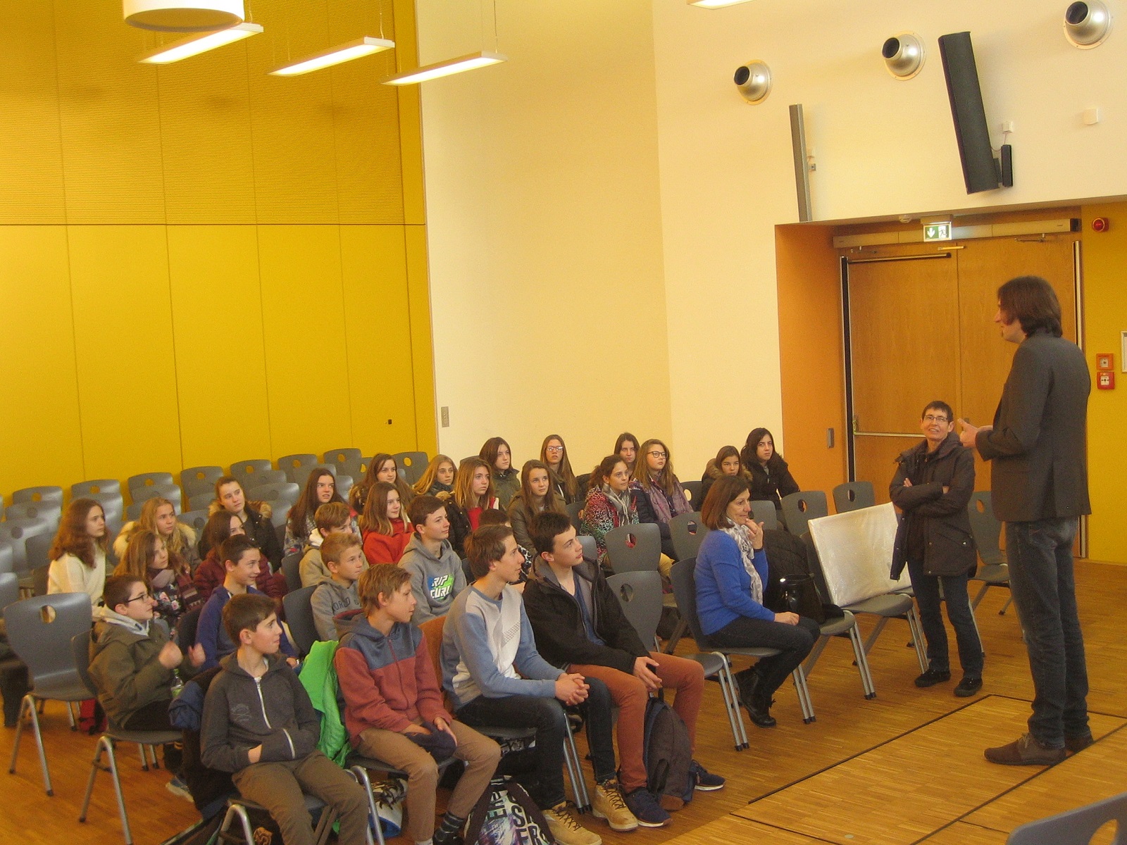 Die Austauschgruppe wurde von Herrn Biemann in der Aula begrüßt.