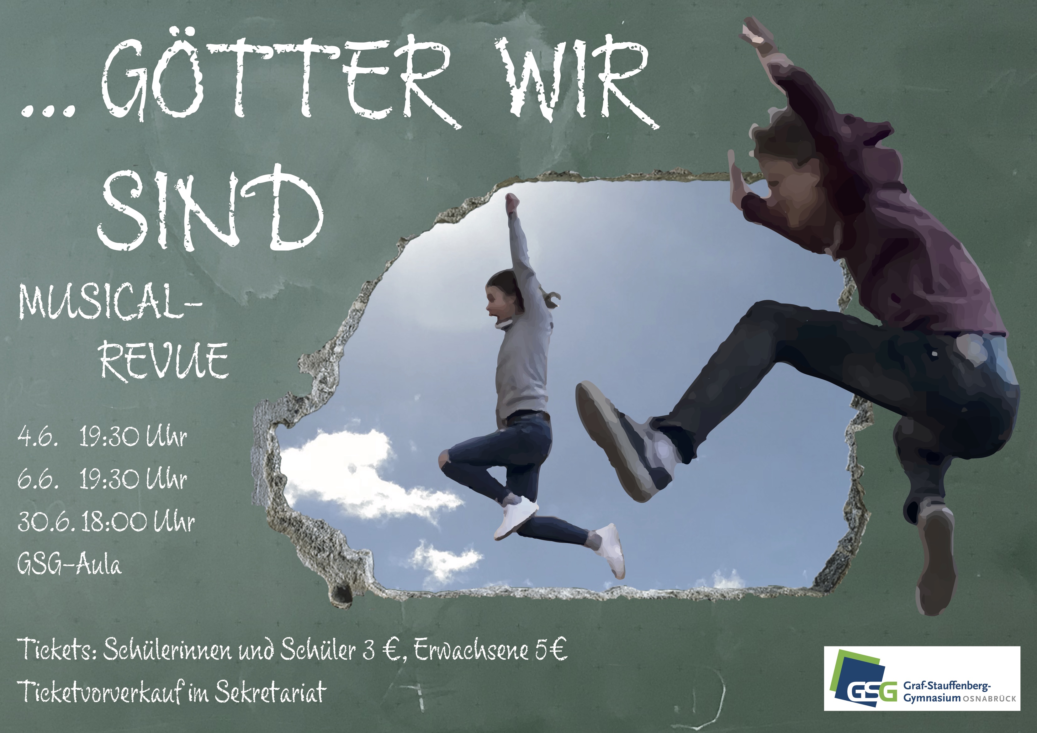 "...Götter wir sind", die neue Musical-Revue von Schülerinnen und Schülern des GSG, wird am 4.6., 6.6. und 30.6. in der Aula des GSG aufgeführt!