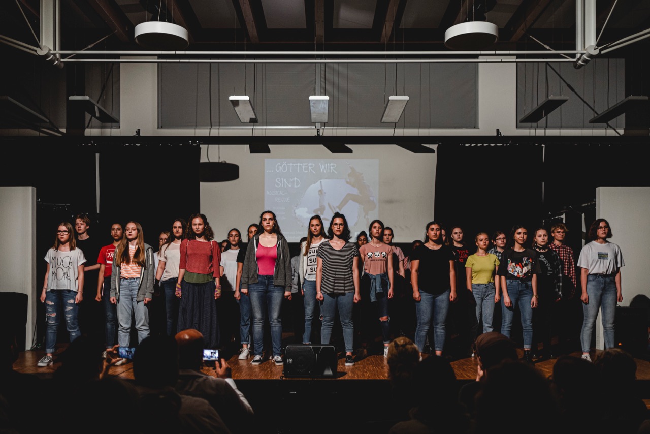 Am 4.6. feierte die neue Musical-Revue "...Götter wir sind" ihre umjubelte Premiere am Graf-Stauffenberg-Gymnasiums. Nachdem die vollständig ausverkaufte Aula in Dunkelheit getaucht worden war, wuchs die Spannung bei Gästen wie Beteiligten spürbar. 60 Minuten später entlud sie sich in langen, stehenden Ovationen für die überragende Leistung der über 100 beteiligten Schüler*innen.