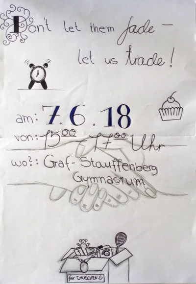 Natürlich ist jeder herzlich willkommen, der am 7. Juni zwischen 15 und 17 Uhr Zeit und Interesse hat, an unserem Tauschhandel in der Mensa des Graf-Stauffenberg-Gymnasiums teilzunehmen. Es dürfen pro Person bis zu maximal 5 Gegenstände mitgebracht werden.