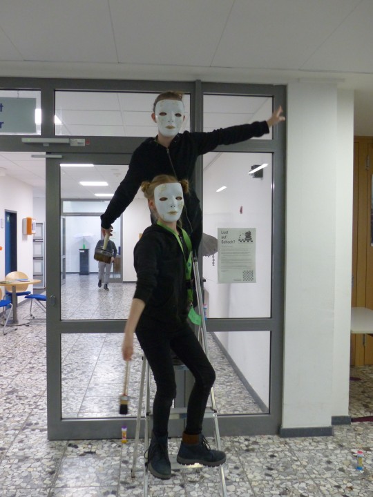 Auch andere Motive der Ausstellung wurden von den Schülerinnen aufgegriffen, wie zum Beispiel Seifenblasen, mit denen die Kunstaktion vor dem Lehrerzimmer begann und die viele neugierige Zuschauerinnen und Zuschauer anlockte. Das lebendige Schulfest bildete den Rahmen, in dem die Schülerinnen im Weiteren ihre Aktion mit einer Leiter, einem Bild, einer Treppe und gegenseitigem Spiegeln durchführten.