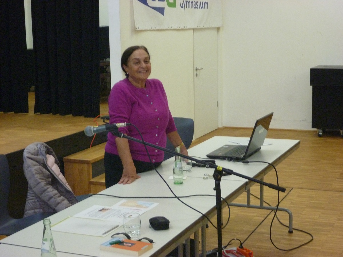 In den Lehrplänen der Fächer Politik und Geschichte wird der Nahostkonflikt nicht (mehr) thematisiert, um so wichtiger war die Begegnung von Schüler_innen des Jahrgang 11 mit der Palästinenserin Sumaya Farhat-Naser. In einem engagierten Vortrag gab sie einen Überblick über die Geschichte des israelisch-palästinensischen Konflikts und berichtete von ihrer täglichen Arbeit mit Frauen und Jugendlichen muslimischer und christlicher Herkunft im besetzten Westjordanland. Die Schüler_innen zeigten sich beeindruckt von einer Frau, die sich trotz jahrzehntelang erlebter Gewalt und Ungerechtigkeit weiterhin für Frieden und Dialog einsetzt.